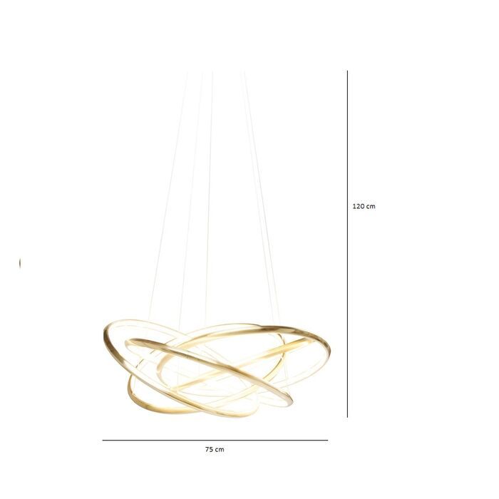 Hängeleuchte: Futuristisch und glamourös. Die aus Aluminium gefertigten, messingfarben lackierten Ringe verschmelzen optisch zu einem geheimnisvollen Ganzen. Die Innenseiten der Ringe sind mit LEDs versehen und lassen dieses moderne Leuchtobjekt faszinieren schimmern. Geeignet zur indirekten Beleuchtung, als Design-Highlight in Ihrer Wohnung und dem Büro. Die Lampe ist höhenverstellbar. Effizienzklasse G, 230 V, 50/60 Hz, mit Transformer, 12 V Gleichspannung, Leuchtmitteltyp LED, Anzahl Leuchtmittel 1, max. 75 Watt, Lumen 3500, Leuchtmittel inklusive, 75 KWh/1000h Lebensdauer 30000 h, Leuchtmittelfarbe in K 3000