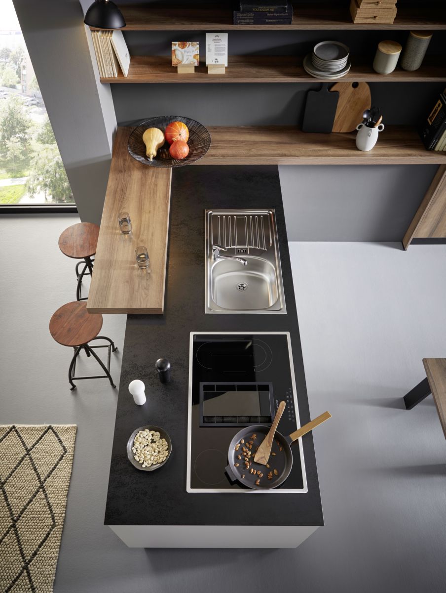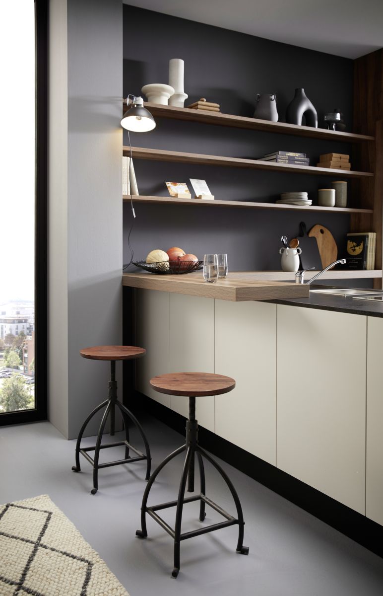 Die Linienführung bei dieser Küche ist klar und im modernen Minimalismus. Durch die harmonische Farbkombination aus Muschelweiß und Nussbaum Nachbildung ist der Wohlfühlfaktor gesetzt.