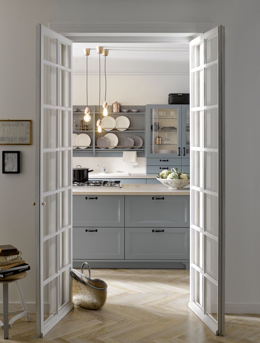 Die blaugrauen Kassetten_Fronten geben dieser Country-Style Küche den typischen Landhaus Flair.