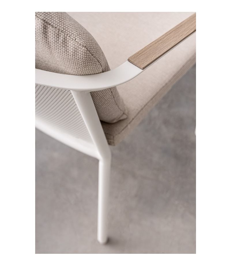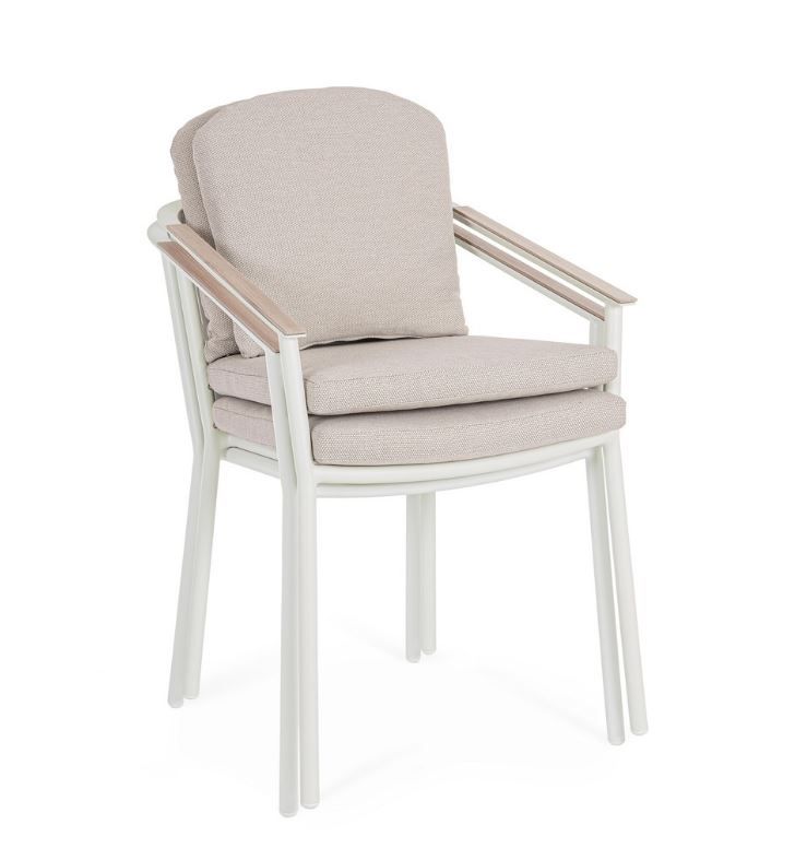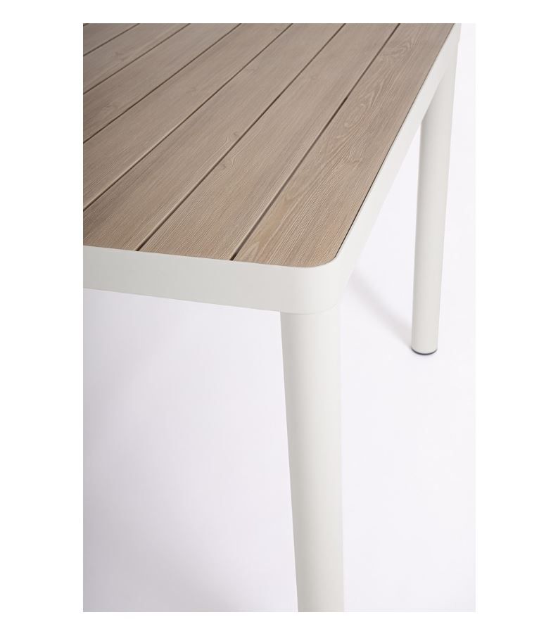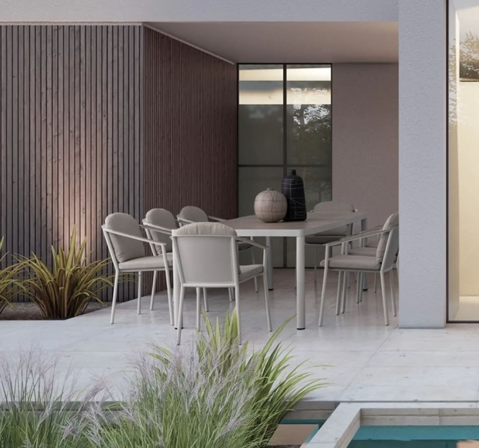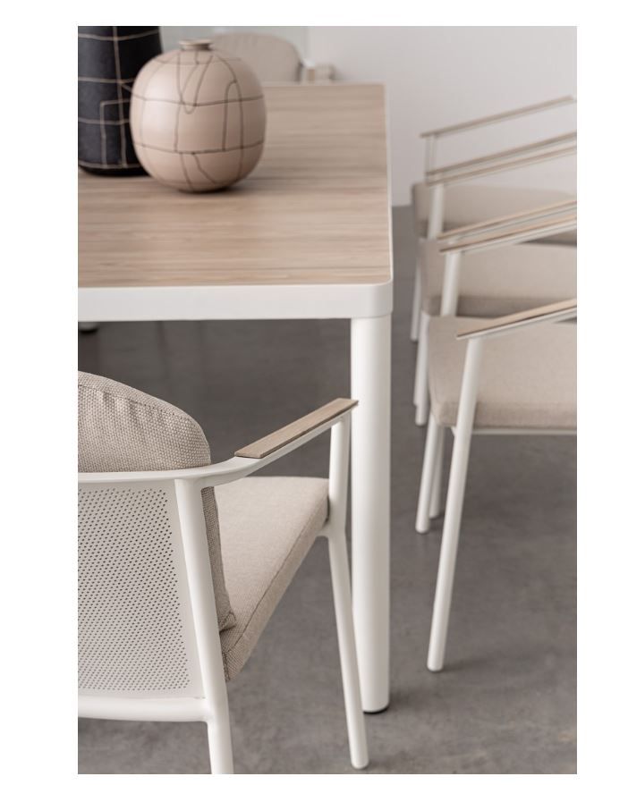 VAPOR, Tischplatte und Armlehnen aus Aluminium mit Holzoptik- Lackierung, Sitz- und Rückenkissen mit abnehmbaren Bezügen aus wasserabweisendem Olefin-Gewebe, 100% Polypropylen, Gestell Aluminium pulverbeschichtet, bestehend aus: 1 x Tisch B 210 x H 76 x T 100 cm, 8 x Stuhl B 55,5 x H 82 x T 55,5 cm inklusive Kissen, Sitzhöhe ca. 50 cm, stapelbar, HINWEIS: Tisch zerlegt